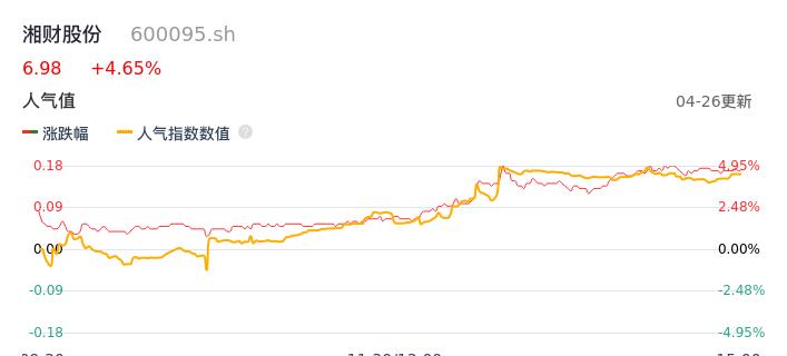 04月26日,湘财股份收报6.98,股价涨幅4.65%,成交金额3.48亿元,换手率1.77%。