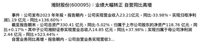 值得注意的是:2024年04月太平洋的夏芈卬分析师,首次发布关于湘财股份的研究报告,标题为:湘财股份(600095):业绩大幅转正 自营同比高增。