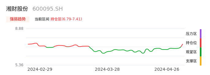 我们来看一下该股的九方特色指标强弱趋势的情况:湘财股份近日从观望区上穿到持仓区。股价短期站稳多头区域,上升动能仍较为充足,可积极关注。后续重点关注上方压力位:7.41元是否能突破上攻。
