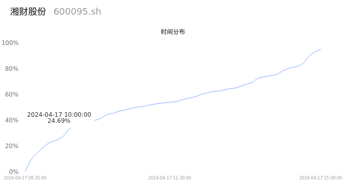 600095湘财股份2024年04月17日成交19.56万手,成交金额1.30亿元,相较昨日缩量5.97万手,换手率0.68%,成交清淡。