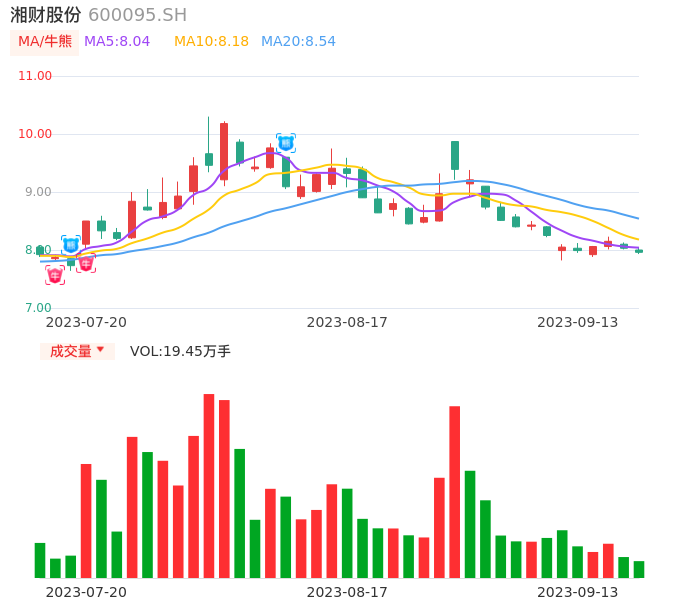 湘财股份在8月11日出现日线级别熊点,且60分钟级别也处于熊点区间,股价处于偏弱行情,注意下方底部下跌扩张K线形态支撑位:7.38元,如果被有效跌穿将进入快速下降通道。