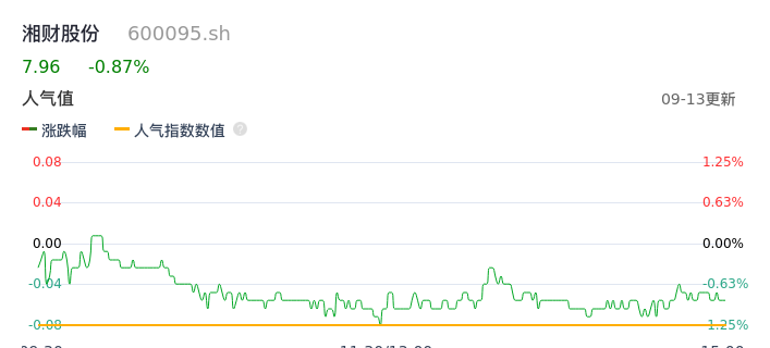 09月13日,湘财股份收报7.96,股价涨幅-0.87%,成交金额1.55亿元,换手率0.68%。