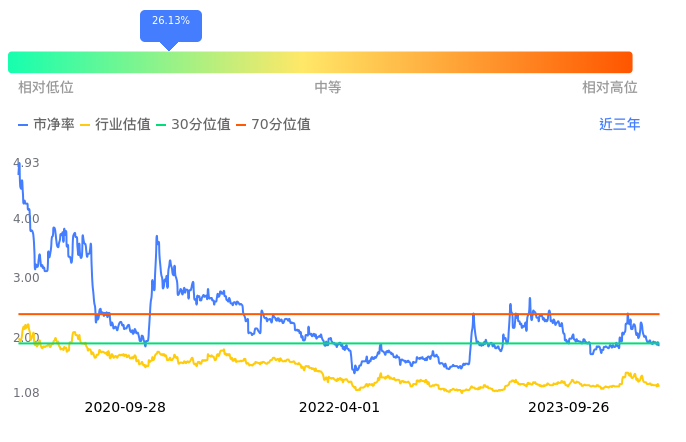 湘财股份当前市净率PB为1.88,在所属的证券中,市净率PB排41,前五名分别为海通证券市净率0.79、国元证券市净率0.89、国泰君安市净率0.92、长江证券市净率0.95、华西证券市净率0.96。湘财股份当前市净率PB为1.88,超过近3年26.13%的历史数据。