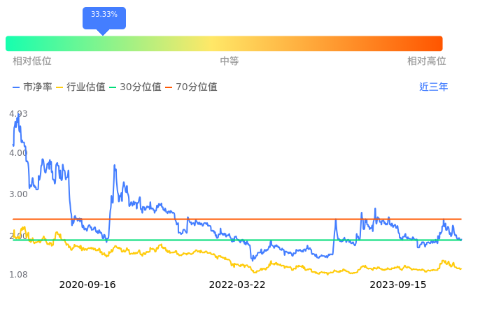 2023年09月15日,湘财股份上涨2.15%收于8.08,今日成交金额2.46亿元。下文将从市盈率PETTM、市净率PB、市现率3个角度去分析公司估值情况。