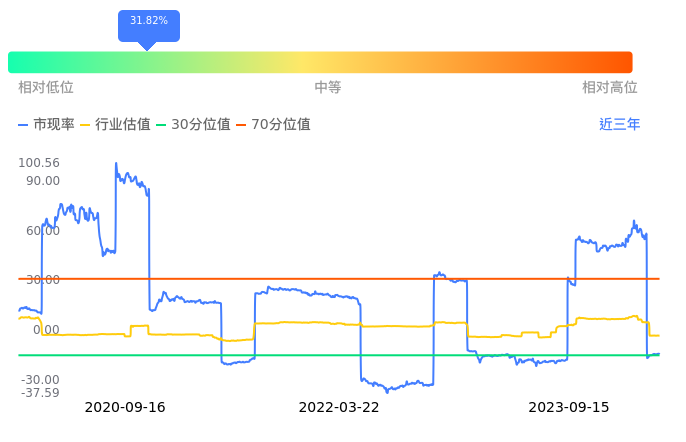 湘财股份当前市现率为-14.31,在所属的证券中,市现率排23,前5名分别为、申万宏源市现率1.82、兴业证券市现率2.66、东北证券市现率3.36、广发证券市现率3.81、国泰君安市现率4.64。湘财股份当前市现率为-14.31,超过近3年31.82%的历史数据。