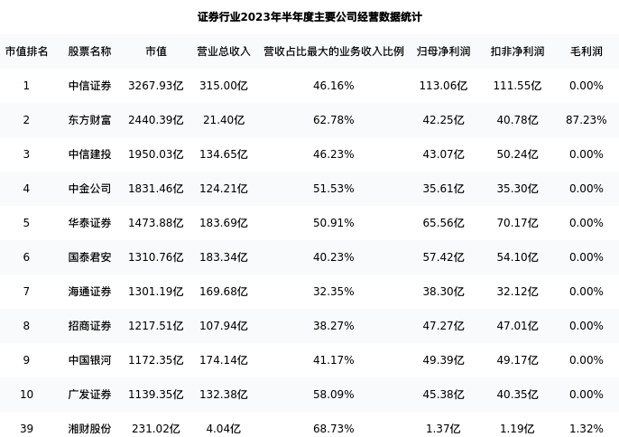 湘财股份最新报告期数据为半年度,下表汇总了证券行业内市值靠前的公司半年度主要经营数据