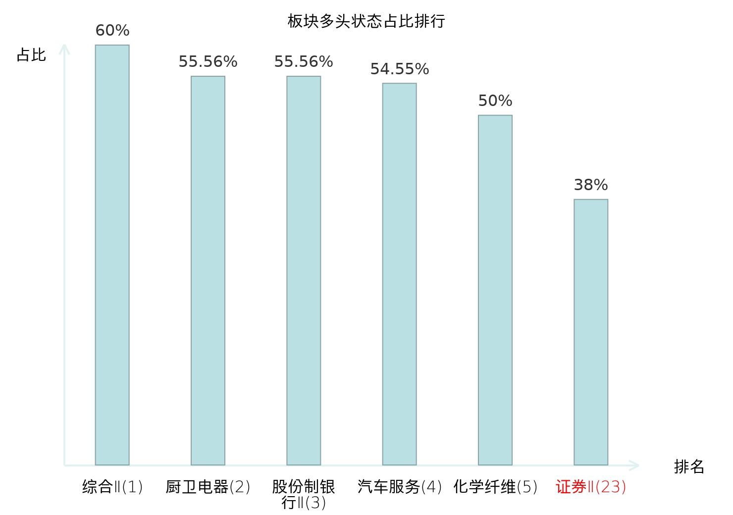 全市场所有行业板块中主力多头状态占比排名中,综合Ⅱ板块位居第一。出版板块名次提升最快,较昨日上升55位。