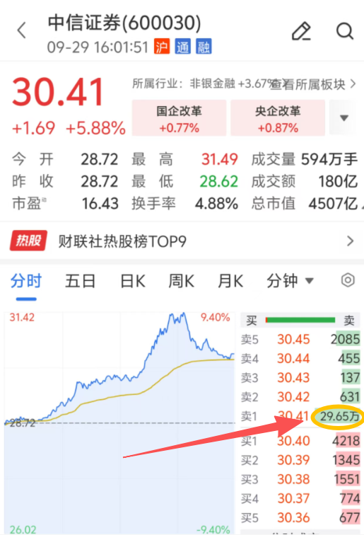 中信证券的大涨引发广泛讨论,盘中最大涨幅为9.64%,收盘涨幅为5.88%,日内成交179.73亿元,较上一交易日增143.32亿元,增幅为393.61%。收盘时,卖一有多达2965.48万股,以收盘时股价30.41元核算,上述市值多达9.02亿元。