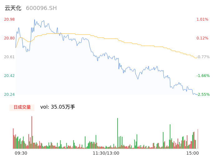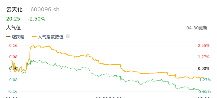 04月30日,云天化收报20.25,股价涨幅-2.50%,成交金额7.22亿元,换手率1.91%。