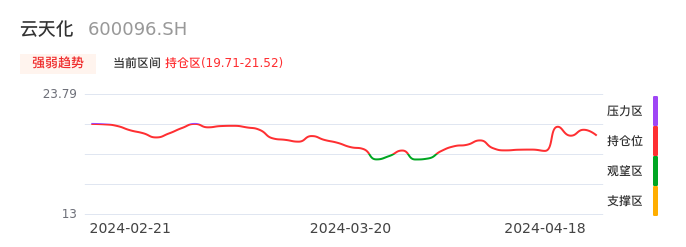 我们来看一下该股的九方特色指标强弱趋势的情况:云天化自03月29日从观望区上穿到持仓区。股价近期在多头区域回调整理。后续重点关注多空分界点的争夺:19.71元。如未能有效站稳则可能重新回到空头行情。