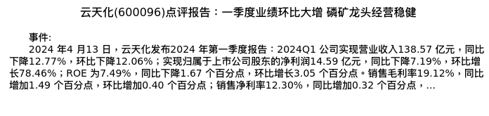 值得注意的是:2024年04月国海证券的李永磊/董伯骏分析师,首次发布关于云天化的研究报告,标题为:云天化(600096)点评报告:一季度业绩环比大增 磷矿龙头经营稳健。