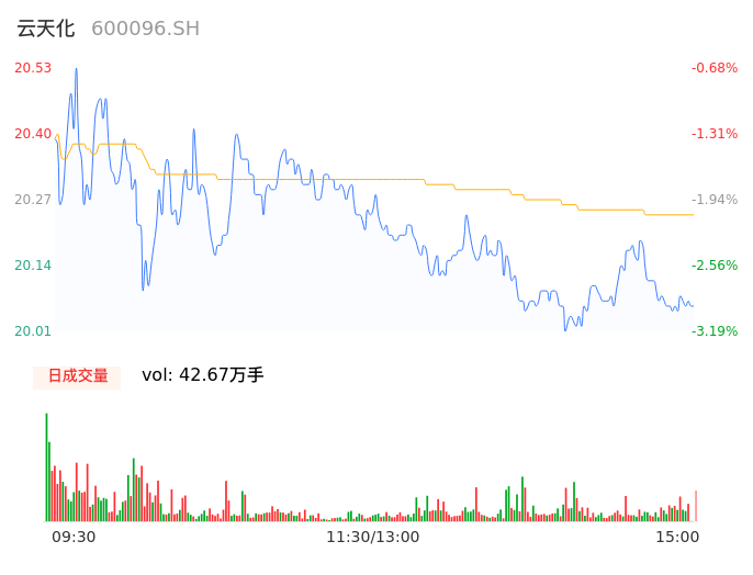 04月23日,云天化收报20.06,股价涨幅-2.95%,成交金额8.63亿元,换手率2.33%。