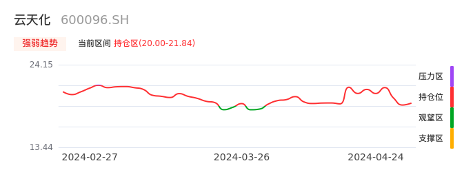 我们来看一下该股的九方特色指标强弱趋势的情况:云天化自03月29日从观望区上穿到持仓区。股价近期在多头区域持续强势上扬,上升动能仍较为充足,可积极关注。后续重点关注上方压力位:21.84元是否能突破上攻。