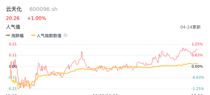 04月24日,云天化收报20.26,股价涨幅1.00%,成交金额5.72亿元,换手率1.56%。