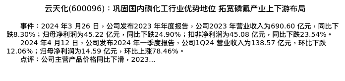 值得注意的是:2024年04月长城证券的肖亚平分析师,首次发布关于云天化的研究报告,标题为:云天化(600096):巩固国内磷化工行业优势地位 拓宽磷氟产业上下游布局。