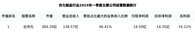 云天化最新报告期数据为一季度,下表汇总了农化制品行业内市值靠前的公司一季度主要经营数据
