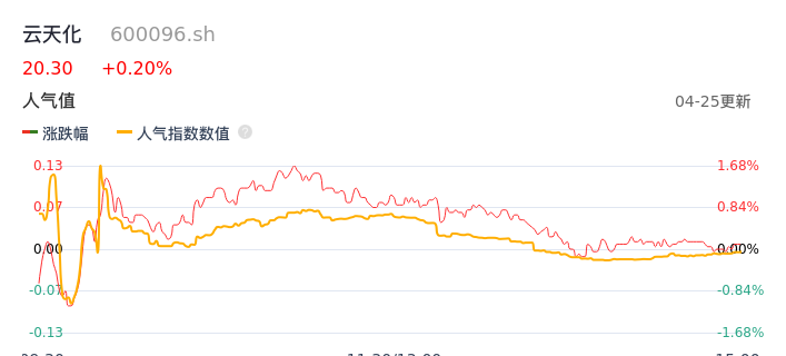 04月25日,云天化收报20.30,股价涨幅0.20%,成交金额6.13亿元,换手率1.64%。