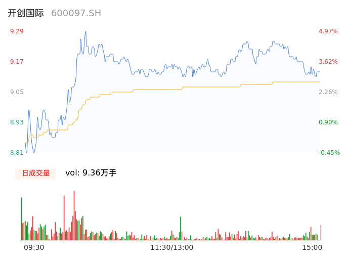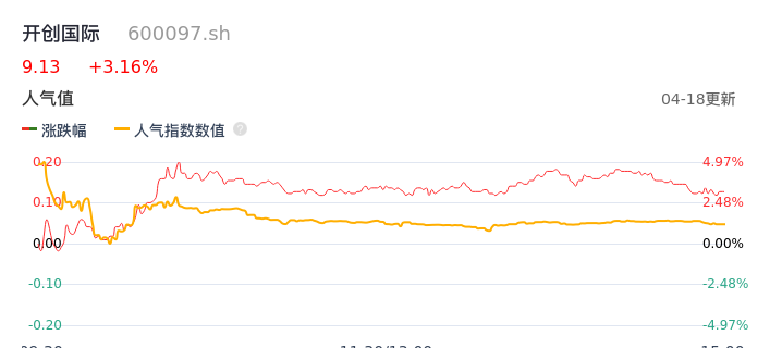 04月18日,开创国际收报9.13,股价涨幅3.16%,成交金额8544.20万元,换手率3.90%。