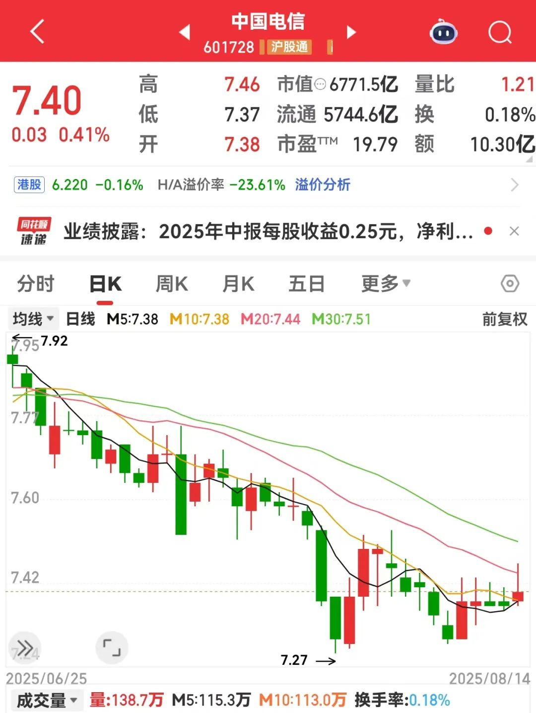 中国电信今日股价涨0.41%,最新收盘价7.4元/股,年内股价累计上涨3.68%。
