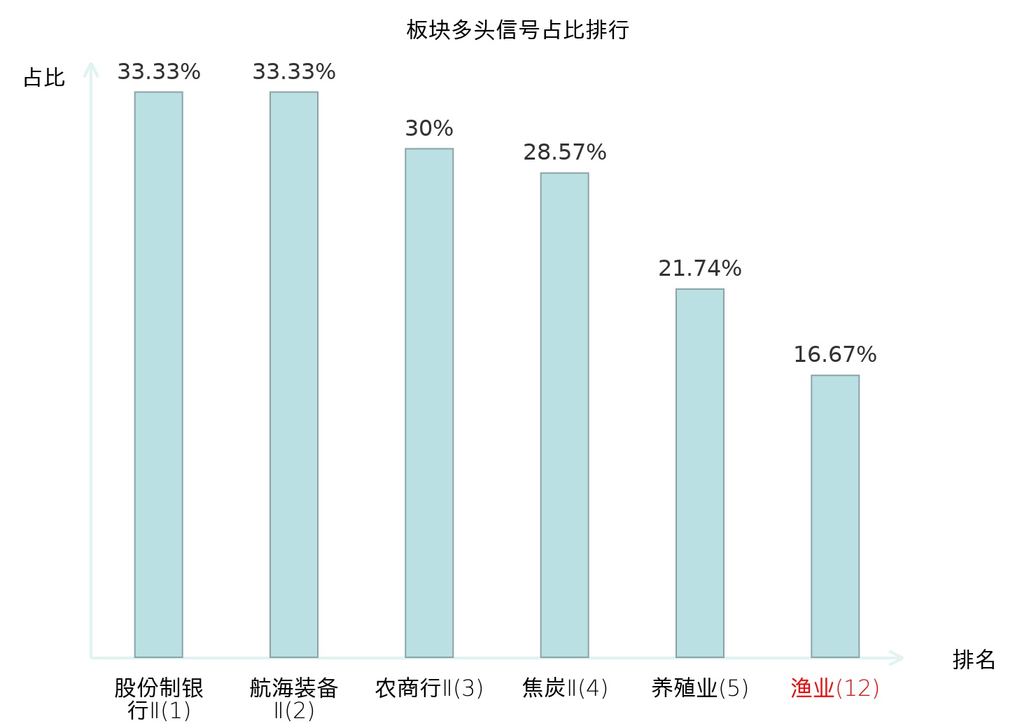 全市场所有行业板块中主力多头信号占比排名中,股份制银行Ⅱ板块位居第一。焦炭Ⅱ板块名次提升最快,较昨日上升119位。