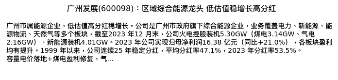 值得注意的是:2024年04月广发证券的郭鹏/姜涛分析师,首次发布关于广州发展的研究报告,标题为:广州发展(600098):区域综合能源龙头 低估值稳增长高分红。