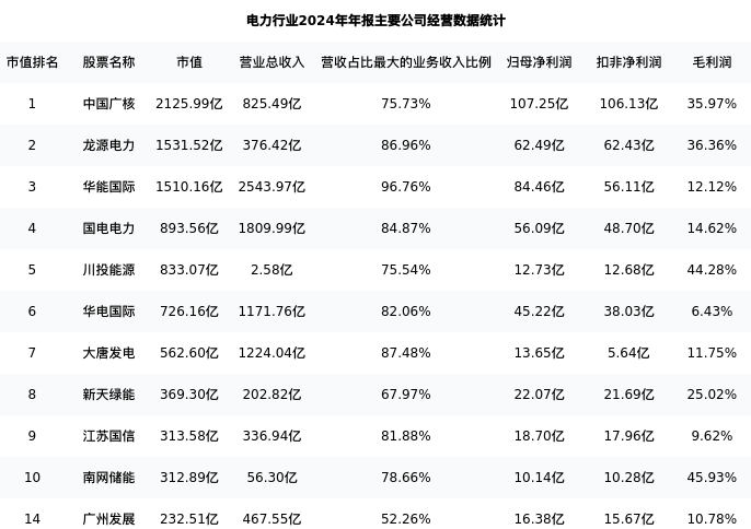 广州发展最新报告期数据为年报,下表汇总了电力行业内市值靠前的公司年报主要经营数据