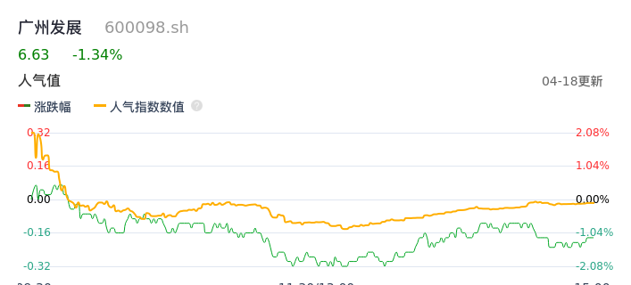 04月18日,广州发展收报6.63,股价涨幅-1.34%,成交金额1.76亿元,换手率0.76%。