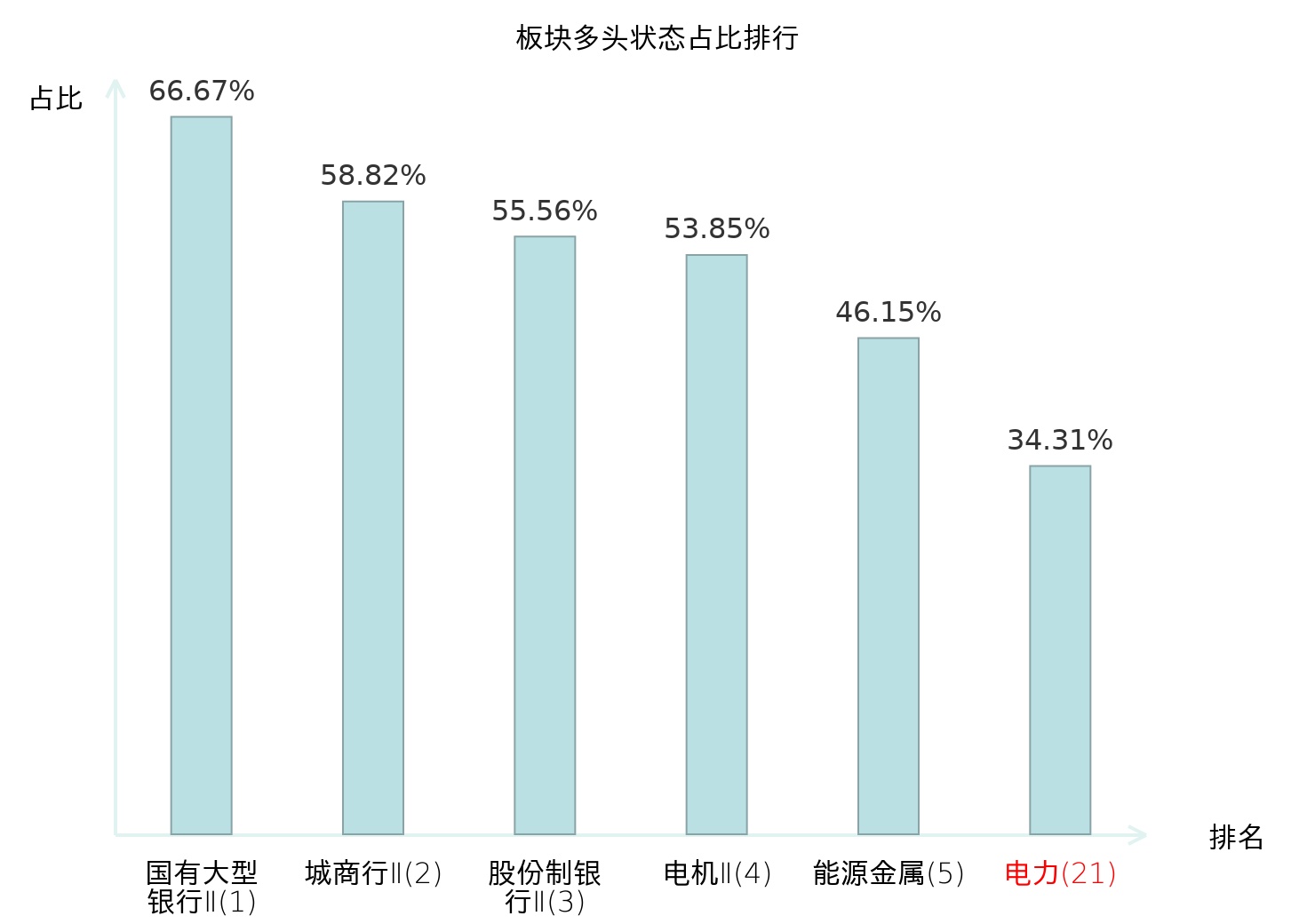 全市场所有行业板块中主力多头状态占比排名中,国有大型银行Ⅱ板块位居第一。自动化设备板块名次提升最快,较昨日上升57位。