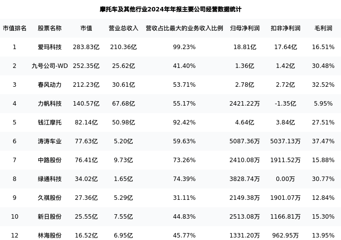 林海股份最新报告期数据为年报,下表汇总了摩托车及其他行业内市值靠前的公司年报主要经营数据