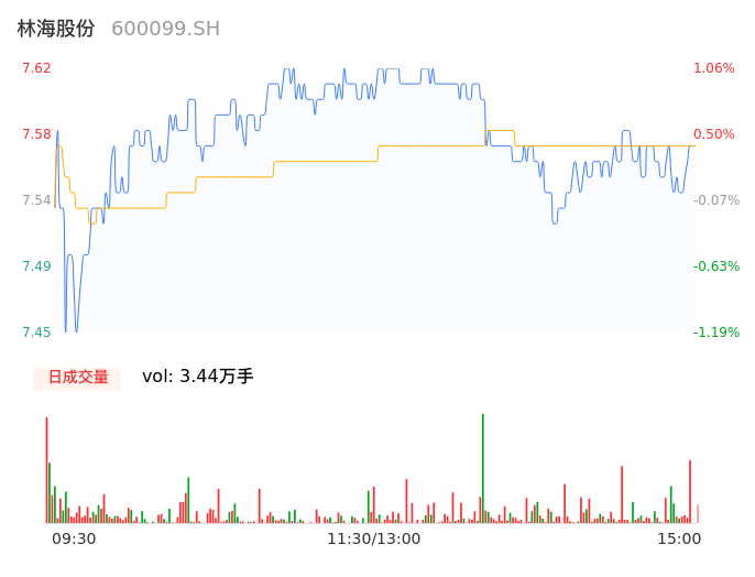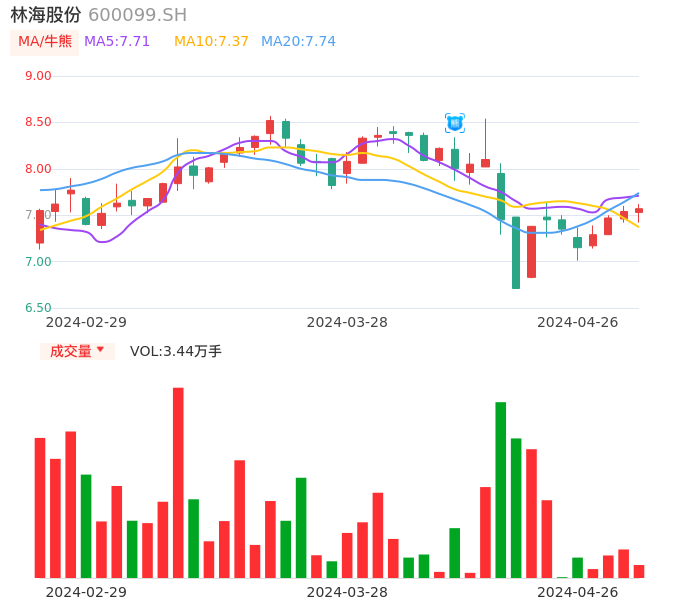 04月26日,林海股份收报7.57,股价涨幅0.40%,成交金额2601.43万元,换手率1.57%。