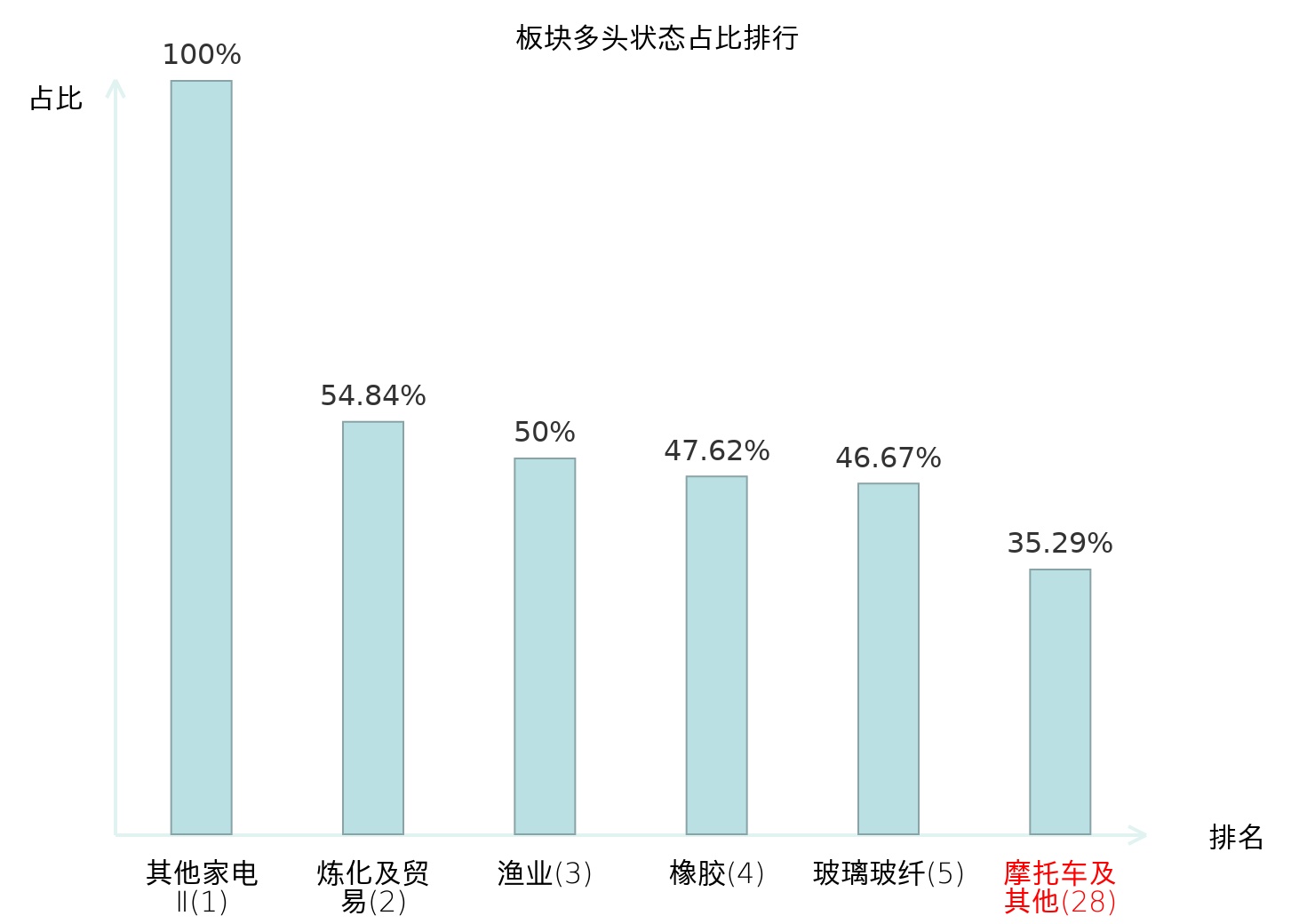 全市场所有行业板块中主力多头状态占比排名中,其他家电Ⅱ板块位居第一。铁路公路板块名次提升最快,较昨日上升37位。