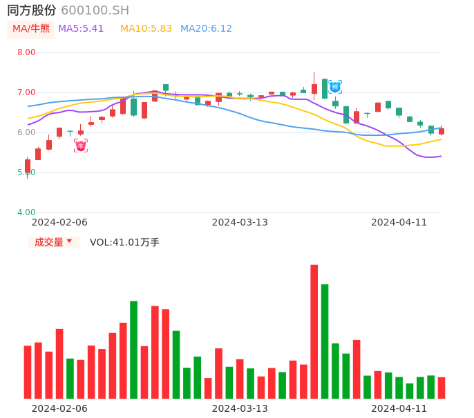 04月11日,同方股份收报6.10,股价涨幅2.01%,成交金额2.50亿元,换手率1.38%。