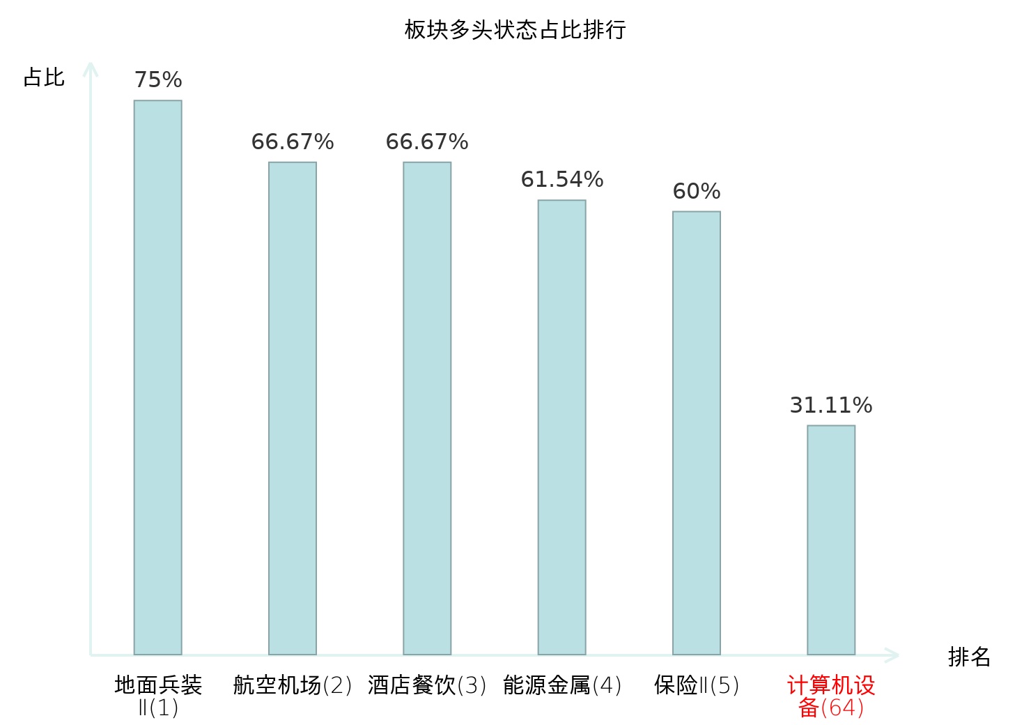 全市场所有行业板块中主力多头状态占比排名中,地面兵装Ⅱ板块位居第一。航天装备Ⅱ板块名次提升最快,较昨日上升103位。