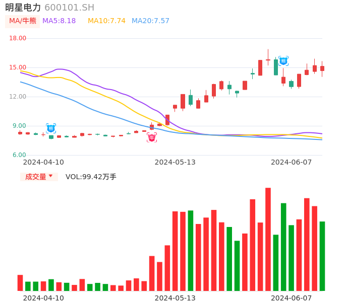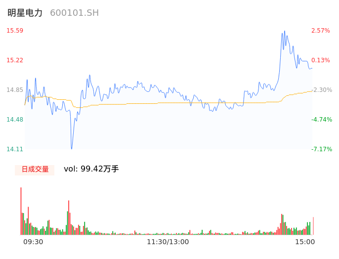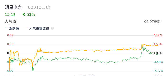 06月07日,明星电力收报15.12,股价涨幅-0.53%,成交金额14.75亿元,换手率23.59%。