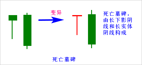 我们来看一看变异后的死亡墓碑,一般是由一根带长下影的T字线和一根大阴线构成,本质上与锤头加墓碑是一样的,只是T字线显示多方力量稍强,股价跌下来后可能还有一次冲高。