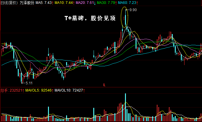 如图所示,2009年12月8日,万泽股份(000534)收出一根T字线,此时多头还很强劲,但明显力道不足。次日该股收出一根高开低走的大阴线,形成T+墓碑的组合。