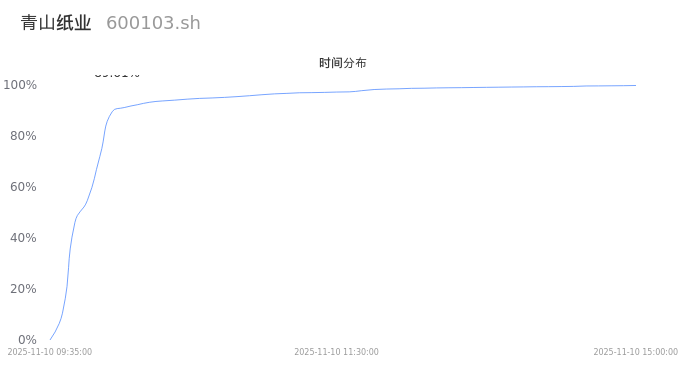 600103青山纸业2025年11月10日成交308.62万手,成交金额12.37亿,相较昨日放量89.93万手,换手率13.95%,成交活跃。