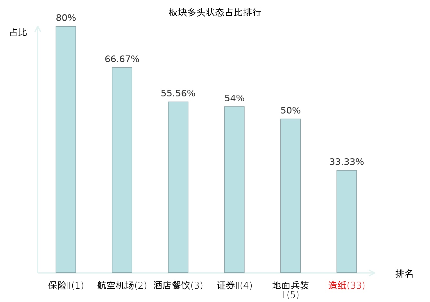 全市场所有行业板块中主力多头状态占比排名中,保险Ⅱ板块位居第一。特钢Ⅱ板块名次提升最快,较昨日上升69位。