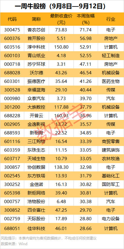本周涨超30%的个股中,按所属行业统计,计算机和电子行业个股居多,均有3股上榜;其次是传媒、房地产、汽车、机械设备行业,均有2股上榜。