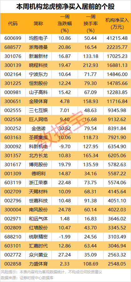 龙虎榜数据显示,本周机构专用席位共现身120股的龙虎榜,净买入54股,净卖出66股。其中,40股获机构净买入超千万元,均胜电子、浙海德曼等共8股获机构净买入金额超1亿元。