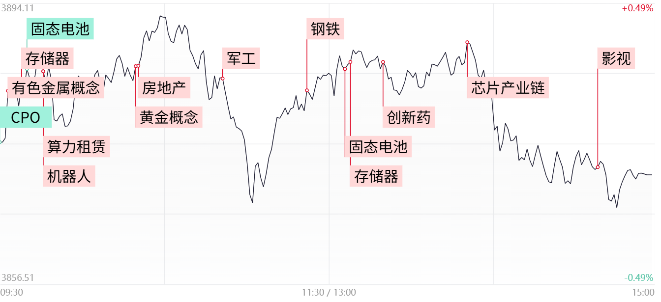 财联社9月12日讯,市场冲高回落,三大指数集体收跌。沪深两市成交额2.52万亿,较上一个交易日放量832亿。盘面上,市场热点较为杂乱,个股跌多涨少,全市场超3300只个股下跌。从板块来看,有色金属板块表现活跃,盛达资源涨停。存储芯片板块逆势上涨,德明利涨停。创新药概念股局部大涨,昭衍新药6天3板。下跌方面,大金融、白酒板块集体下跌。截至收盘,沪指跌0.12%,深成指跌0.43%,创业板指跌1.09%。