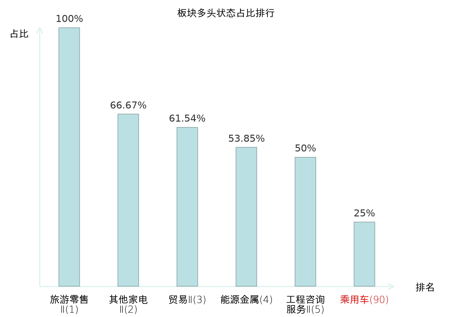 全市场所有行业板块中主力多头状态占比排名中,旅游零售Ⅱ板块位居第一。冶钢原料板块名次提升最快,较昨日上升37位。