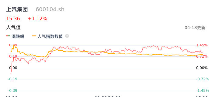 04月18日,上汽集团收报15.36,股价涨幅1.12%,成交金额3.76亿元,换手率0.21%。