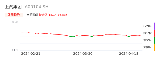 我们来看一下该股的九方特色指标强弱趋势的情况:上汽集团自04月15日从观望区上穿到持仓区。股价近期在多头区域持续强势上扬,上升动能仍较为充足,可积极关注。后续重点关注上方压力位:16.53元是否能突破上攻。