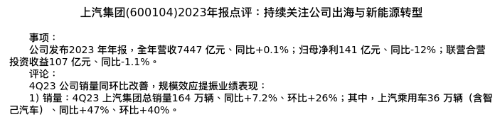 值得注意的是:2024年04月华创证券的张程航分析师,首次发布关于上汽集团的研究报告,标题为:上汽集团(600104)2023年报点评:持续关注公司出海与新能源转型。
