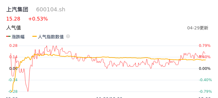 04月29日,上汽集团收报15.28,股价涨幅0.53%,成交金额3.92亿元,换手率0.22%。