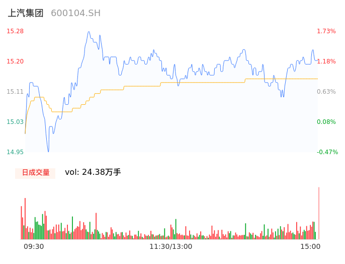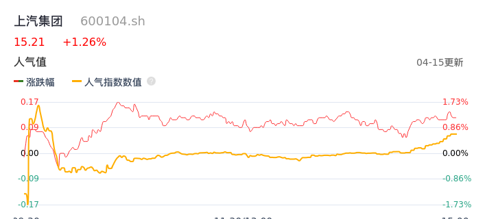 04月15日,上汽集团收报15.21,股价涨幅1.26%,成交金额3.69亿元,换手率0.21%。