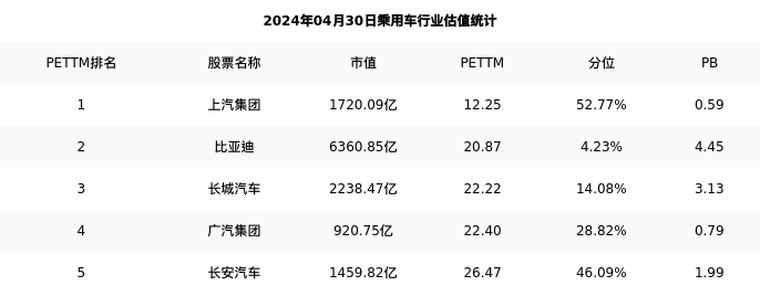 从估值角度看:上汽集团最新市盈率PETTM为12.25,在行业内排名1/8,处于52.77分位。