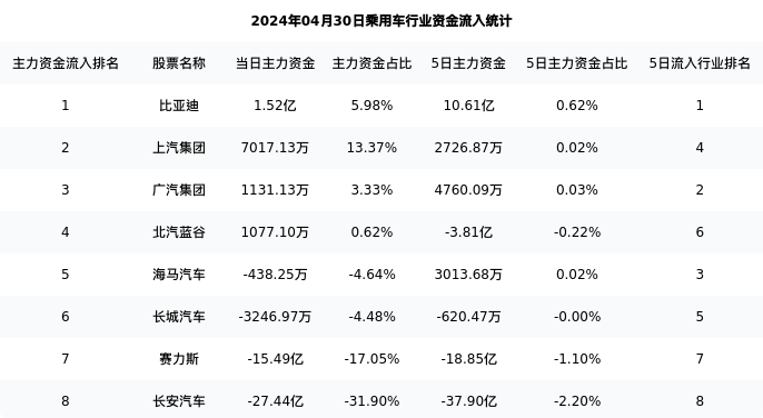 从主力资金流向来看,乘用车行业今日主力资金流入97.77亿元,在所有申万二级行业中排名:42/131。