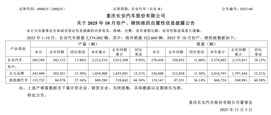 长安汽车11月2日的公告显示,公司10月新能源汽车销量为11.92万辆,同比增长36.14%;今年前10月其新能源汽车累计销量达86.87万辆,同比大幅增长60.58%。